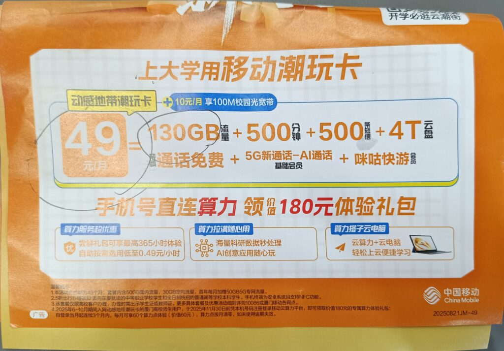 昨天新生报到日,手机网络运营商都来做生意。很幸运,教职工也在优惠范围。护照也能办。我也有了移动潮玩卡(+宽带)。